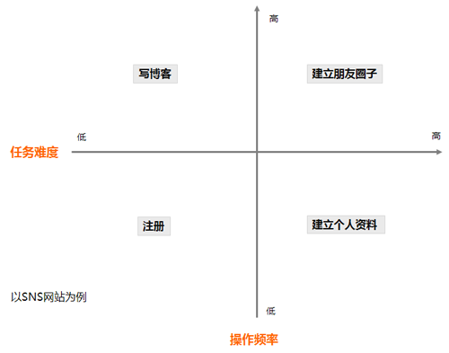 确定新手任务之后,对任务的特征进行分析。我们从两个维度来分析一个任务:任务难度和操作频率。下图是以SNS网站为例,列举了4个任务,分别对应了4种不同的任务特征: